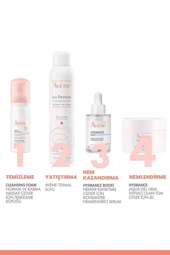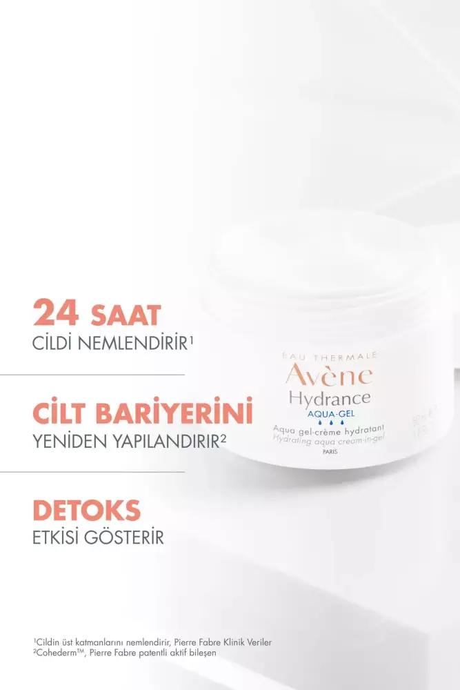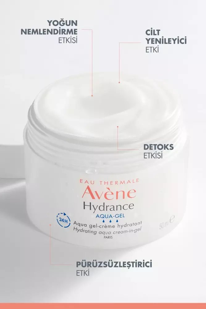 Avene Hydrance Aqua Gel Cream 50ml;Nem İhtiyacı Olan Tüm Ciltler İçin Jel;Neme ihtiyaç duyan tüm hassas cilt tipleri için nemlendirmeye, yatıştırmaya yardımcı olur.;Kullanım Şekli :;Gündüzleri yüzünüze, boynunuza ve göz altınıza ince tabaka olarak akşamları kalın bir tabaka halinde tüm gece kalacak şekilde uygulayınız.;Ürün İçeriği :;Avene thermal spring water (avene aqua),glycerin,pentylene glycol,1,2-hexanediol,dimethicone,isocetyl stearoyl stearate,triethylhexanoin,caprylic/capric triglyceride,betaine,methyl gluceth-20,polyglyceryl-10 myristate,acrylates(c10-30 alkyl acrylate crosspolymer,bht,bis-peg-18 methyl ether dimethyl silane,c12-20 alkyl glucoside,c14-22 alcohols,carbomer,citric acid,cucurbita pepo (pumpkin) seed oil,fragrance(parfum),phytosterols,potassium hydroxide,sodium citrate,sodium dextran sulfate,sodium hyaluronate,squalane,tocopheryl glucoside,water(aqua);%100 orjinal üründür.;Ambalajı açılan ürünlerin iadesi kabul edilmemektedir.