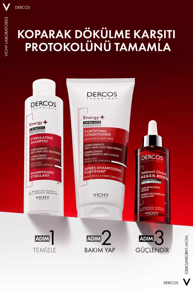 Vichy Dercos Aminexil Clinical R.E.G.E.N. Booster, saç dökülmesi ile mücadele etmeye yöneltilmiş ileri düzey bir serumdur.